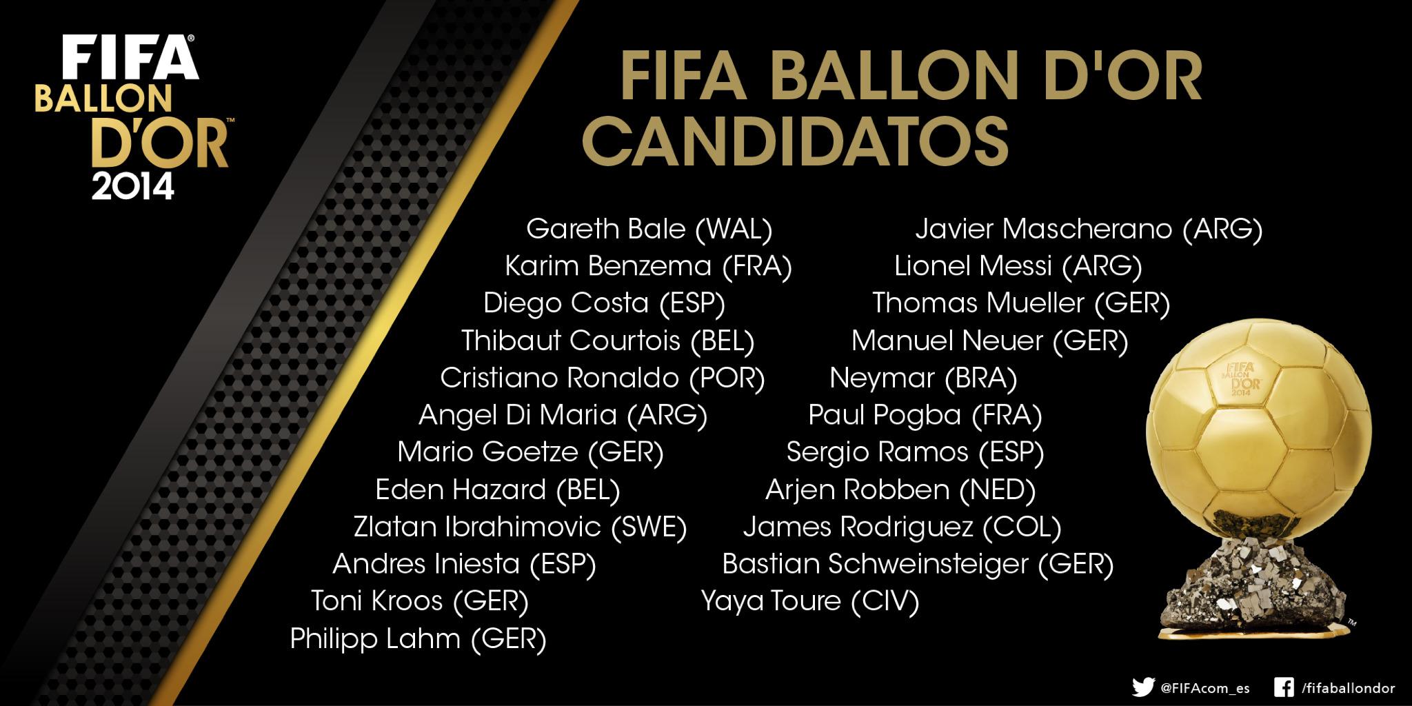 La verdad es que en la lista de 23 hay de todo: alemanes que lo merecen por el Mundial (Muller, Neuer, Lahm, Schweinteiger - éstos dos incluso por trayectoria - ), madridistas o ex madridistas que lo merecen por la Décima (Ramos, Di María, Bale, Benzema), atléticos por el temporadón realizado (pocos, ya que sólo están Diego Costa y Courtois), jugadores que siempre están a un gran nivel (Ibrahimovic, Yayá Touré, Iniesta, Robben) o incluso jóvenes a los que vemos progresar a pasos agigantados (Neymar, Pogba, Götze, James, Hazard). Aun así, decir que todos estos cracks son candidatos es hablar demasiado. Podemos decir que son candidatos a estar en la terna de favoritos junto a los 2 que me faltan. Sí, estoy hablando, como no podía ser de otra manera de Cristiano y Messi.